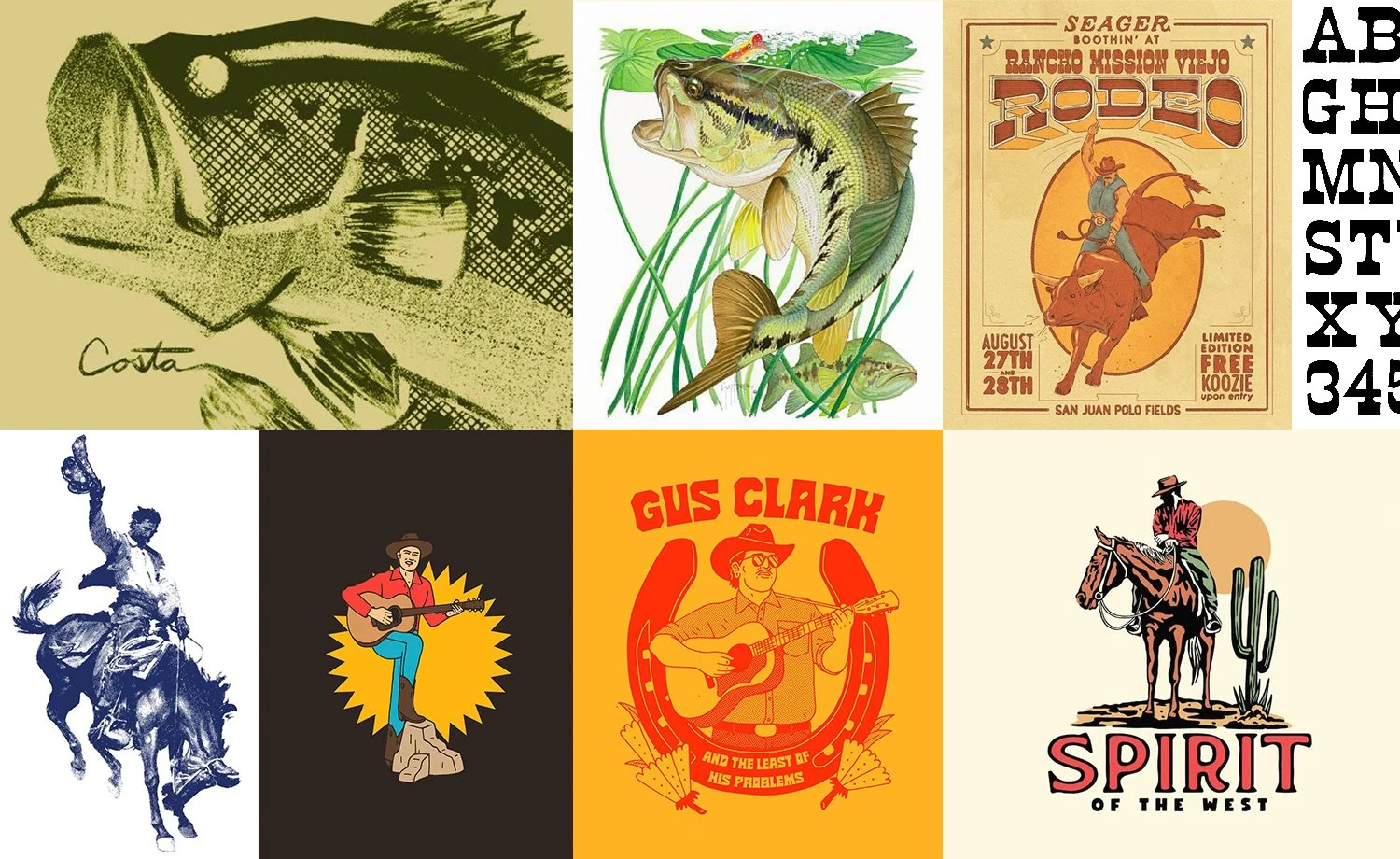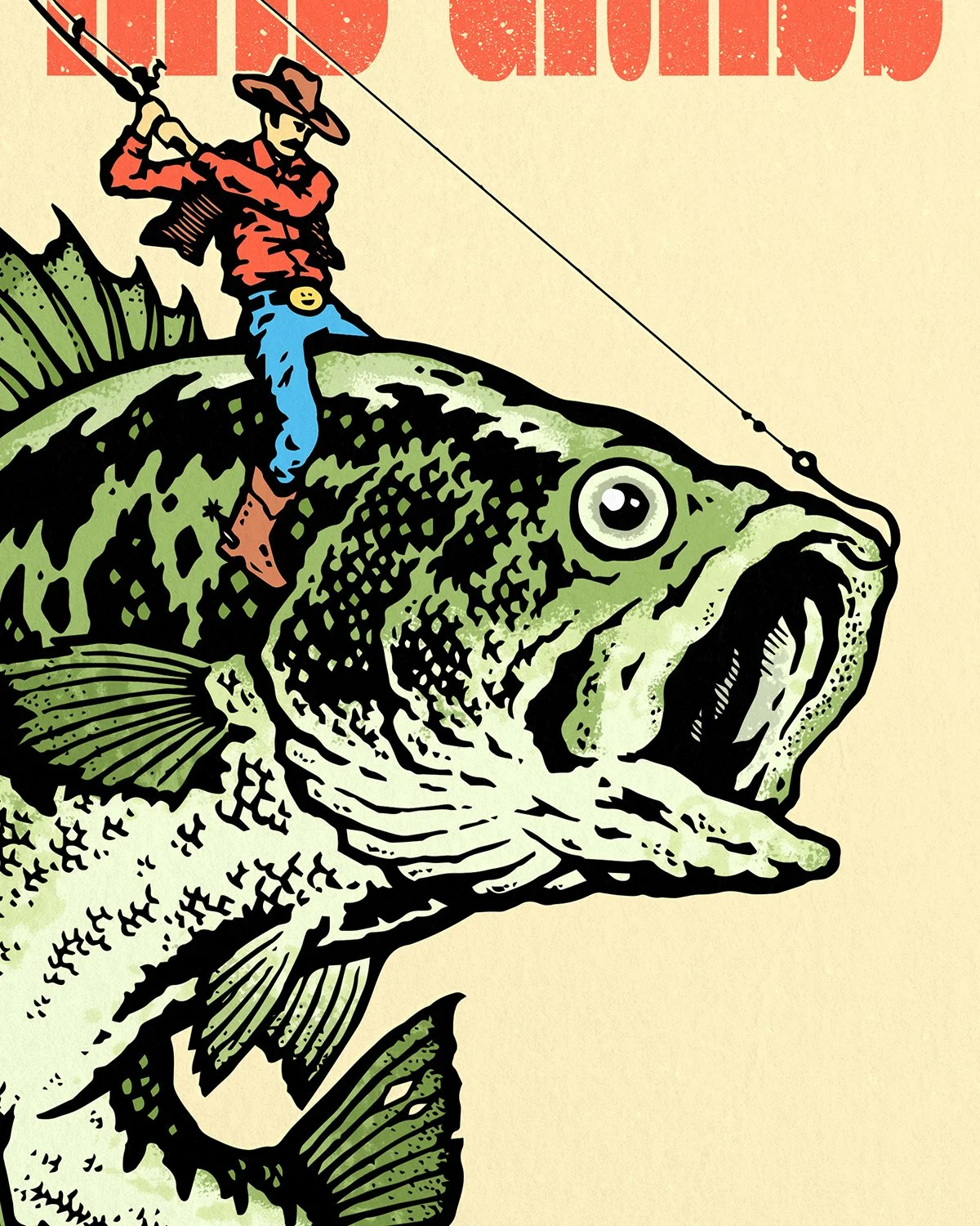 For Bass & Grass No. 13, I designed graphics and merch inspired by old school rodeo posters. I had tons of fun researching 1800s slab serif fonts and drawing a “bucking bronco” style largemouth bass!