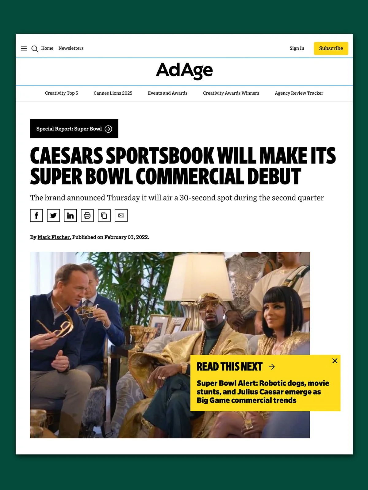 Our role running Caesars’ social channels leveled up during the brand’s Super Bowl debut. We amplified the spectacle with a comprehensive strategy that captured the pageantry, excitement, and cultural heat of the moment—before, during, and after the game. This included a full behind-the-scenes content capture, showing an inside look at the making of the spot.